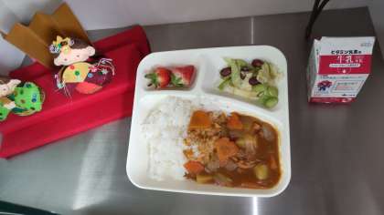 今日の給食は、チキンカレーライス、牛乳、ビーンズサラダ、いちごです。