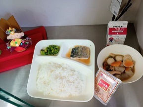 今日の給食は、ごはん、牛乳、さごしのおろしじょうゆかけ、さといもと野菜の含め煮、なのはなのおひたしです。