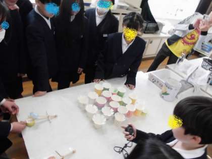 今日は3年生が、おもちゃランドに6年生を招待していました。理科で学習した風やゴムの働きを使ったおもちゃやゲームを作り、6年生に楽しんでもらっていました。感謝の気持ちも伝えられ、6年生も喜んでいました。