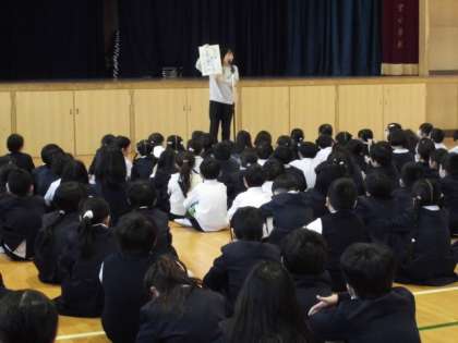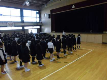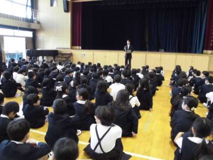 全校朝会 公開日 2025/04/14 更新日 2025/04/14 学校日記 今年度初めての全校朝会がありました。今日は雨で地面がぬかるんでいたので講堂で行いました。 校長先生から雷についての話や、復帰された先生の紹介、看護当番からの4月の生活目標など話があり、みんな真剣に話を聞いていました。 いいね(0)