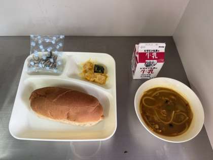 今日の給食は、黒糖パン、牛乳、カレースパゲッティ、かぼちゃのマリネ焼き、ミニフィッシュでした。