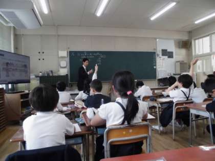 3年生、4年生は算数の筆算をしていました。計算の工夫を話し合いながら学習を進める様子を見てもらいました。