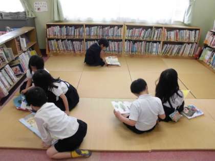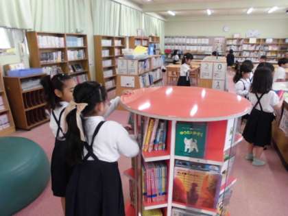木曜日は図書館司書さんが来校しています。1年生は、図書室で本の貸し借りと読書をしていました。
