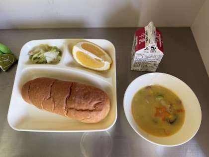 本日の給食は、黒糖パン、牛乳、鶏肉とコーンシチュー、キャベツのひじきドレッシング、かわちばんかんでした。