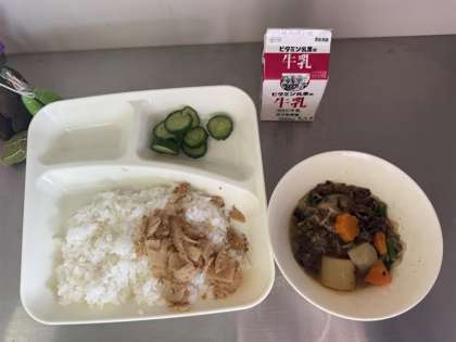 今日の給食は、ごはん、牛乳、肉じゃが、きゅうりの酢もの、ごまかかいためでした。