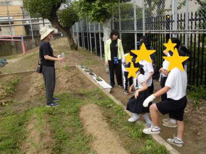今日は水やりの役割分担や方法を確認し、実際に体験していました。今年はおもちゃカボチャ、バジル、トウモロコシを育てています。