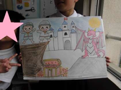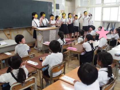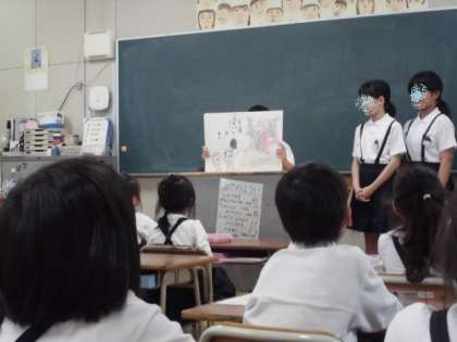 今日は、1年生の教室で、6年生が作った紙芝居の読み聞かせをしていました。3班に分かれて作った紙芝居で、それぞれがオリジナルストーリーを考えていました。