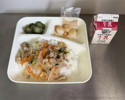 今日の給食は、豚丼、牛乳、きゅうりのかつお梅風味、白玉だんごでした。