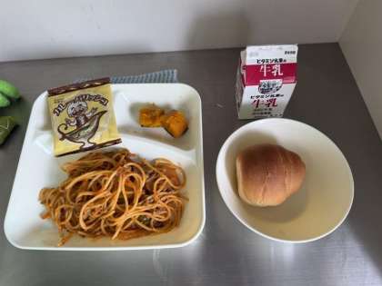 今日の給食は、ミニコッペパン、牛乳、ミートソーススパゲッティ、焼きかぼちゃ、カレーフィッシュでした。