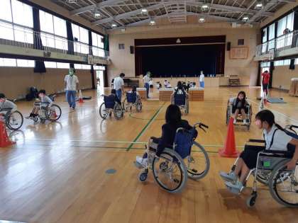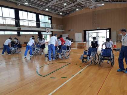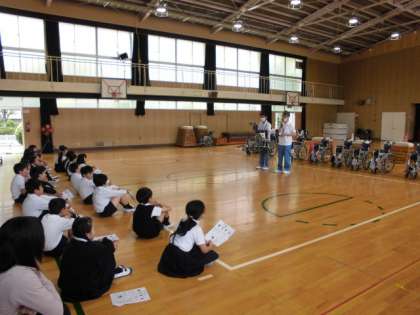今日は5年生が車いす体験をしていました。福祉に関する学習の一環として、車いすの知識や乗り方を教えてもらいました。