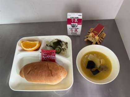 今日の給食は、コッペパン、イチゴジャム、牛乳、鶏肉のかぼちゃのシチュー、ミックス海そうサラダ、オレンジでした。