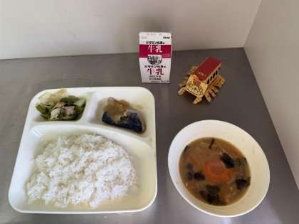今日の給食は、ごはん、牛乳、さごしのおろしじょうゆかけ、みそ汁、野菜いためでした。