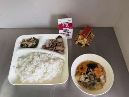 今日の給食は、ごはん、牛乳、豚肉のしょうが焼き、五目汁、ツナと野菜のいためものでした。