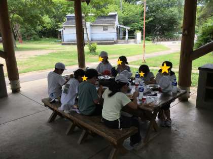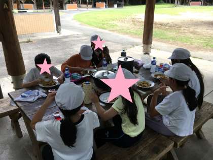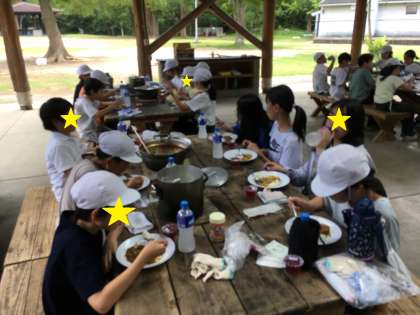 カレー作りが始まりました。具材を切る係と火を起こす係に分かれて活動しました。無事完成し、班のみんなでおいしく食べました。