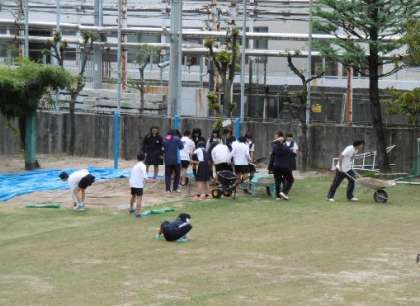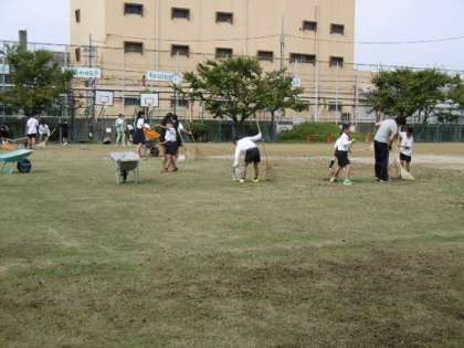 運動場の芝生の育成の一環として「エアレーション(地面に機械で穴をあける作業)」と「冬芝の種と砂をまく作業」を行いました。休み時間に児童のみなさんもしっかりとお手伝い。運動の芝生が今よりももっといい状況になることを願っています。