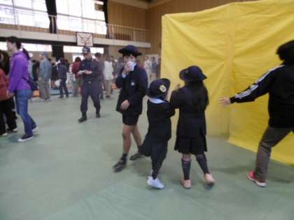 昨年度より、土曜授業で小学校と森之宮地域、関係機関が合同で防災訓練を行っています。今年度は 1、水消火器(城東消防署)2、スモークハウス(城東消防署)3、応急処置(森之宮病院)4、担架搬送(城東消防署)の4つの体験を、地域防災リーダーの方々に各体験で支援いただきながら行いました。