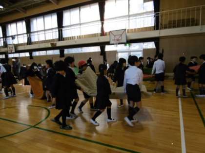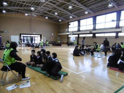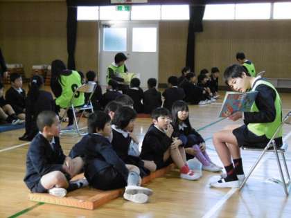言語活動の充実の一環として、本校では水曜日の朝、児童集会の時間を活用して2学期6年生が、3学期5年生が「わくわく班」での読み聞かせを行っています。今回は6年生が取り組みました。どんな本を選んだらみんなが楽しめるのかな?と相手のことを考えて本を選び、読み方も練習して当日に臨みます。どの班も集中して聞いていました。寒かったので、マットを引きましたが、準備も後片付けも班で協力しています。