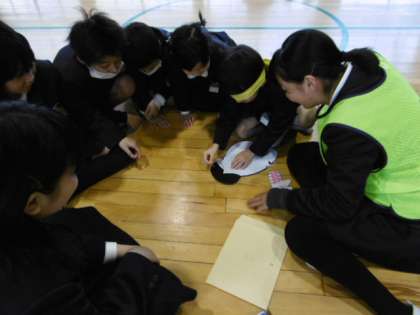 集会委員会は、わくわく班で楽しく取り組めるゲームなどを企画しています。今回は「福笑い」に取り組みました。途中で終わってしまうかも?と考えた班長さん。優しく丁寧に説明をしてどの班も1年生から行っていました。