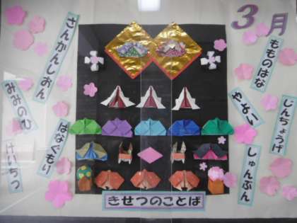 本校の玄関に展示ケースがあり、児童の作品を中心に展示しています。壁には季節感を大切にしたものも掲示しています。来校のおりには是非ご覧ください。3月の掲示物です。