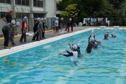 日本赤十字社大阪府支部の指導員の方を2名を講師におむかえし、5,6年生を対象に「命を守る学習」として着衣泳の体験学習を行いました。講師の方に、「溺れそうになったらまず、浮くことを一番に考えて」「身近なペットボトルや適当な大きさのナイロンの袋で命が助かることもある」等のお話を子どもたちは真剣に聞き、体感していました。指導員の皆様ありがとうございました。