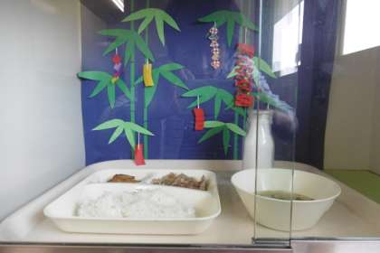 給食では、「旬」を大切にした献立となっています。7月は夏に旬を迎える「夏野菜」かぼちゃ、ゴーヤ、なす、トマトなどがあります。学校では子どもたちが食事を楽しくとれるように工夫をしていますが、調理員さんによる給食室の掲示もその一つです。7月は七夕です。
