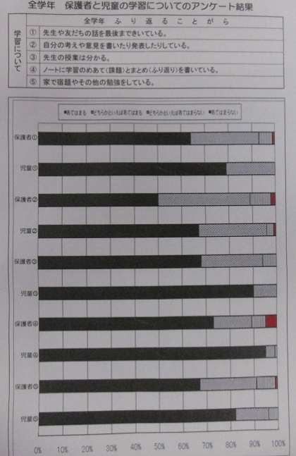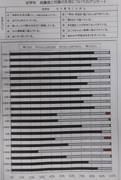 森之宮小学校では、保護者の皆様のご意見をいただき学校の教育活動を振り返り、改善にいかしています。児童・保護者の学校アンケートも年間2回行っています。今回9月に行いましたアンケート集計がまとまりました。保護者の皆様に配布いたしました一部を載せました。ご協力ありがとうございました。