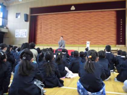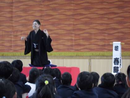 全学年、文化庁の事業で、山本能楽堂による上方芸能≪落語≫に触れることができました。お囃子の体験や扇子をお箸に見立てた体験学習、落語の歴史を聞いた後に、落語家桂春蝶さんによる落語を聞きました。心がほっとする笑いがあふれる体験となりました。