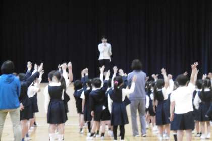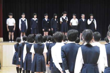 月曜日の全校朝会では、看護当番の先生が毎月の生活目標と運営に関する計画の項目内容のことを取り上げふり返らせています。この写真は、「家で宿題や自主勉強をしていますか。持ち物に名前を書いていますか。」と聞いているところです。次の写真は、前期運営委員会の児童があいさつをしているところです。その後今年度の児童会目標を発表しました。