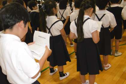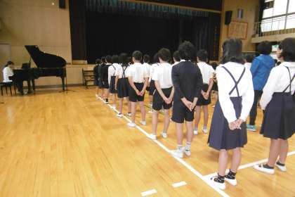 6月6日(水)の児童集会は音楽集会で、校歌の練習をしました。担当の先生から、校歌は始業式や終業式、運動会の時歌うことや、今年度は40周年式典でも歌うことを伝えていました。みんなとても元気に歌っていました。