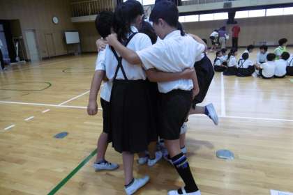 7月4日(水)は朝から気温30度の中、新聞のり集会をしました。新聞を1回折り、さらに1回折り、また折るというように新聞をどんどん小さくしていきます。その上に、わくわく班のメンバーが片足で立ったりおんぶしたりして乗っていくという集会です。低学年の子どもは、汗を流しながらも6年生におんぶしてもらってうれしそうでした。