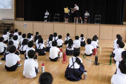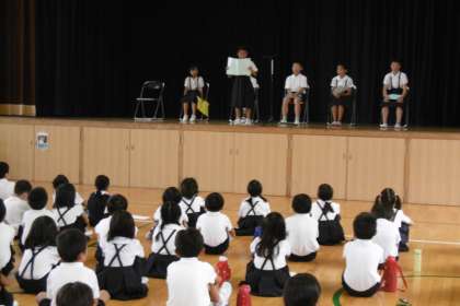 暑い中、規律ある終業式を終えることができました。児童の発表では、6人の子どもが1学期がんばったことと2学期がんばることを発表しました。
