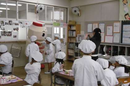 給食の時間に着ぐるみのヤクルトさんから本物のヤクルトをいただきました。