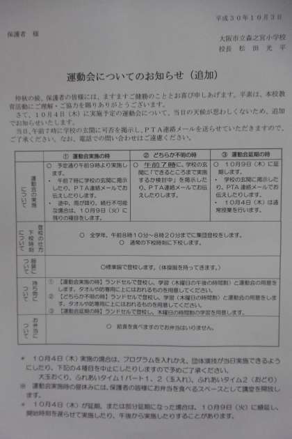 本日、運動会についてのお知らせ〈追加)を配付しました。天候により、「運動会を実施する。途中で中止する。延期する。」と実施内容に違いがありますが、どのようになりましても、体操服の用意をし、標準服で登校すること。ランドセルで木曜日の学習の準備をして登校すること。としています。どうぞご理解のほどお願いします。5・6年生により机といす運びもしました。