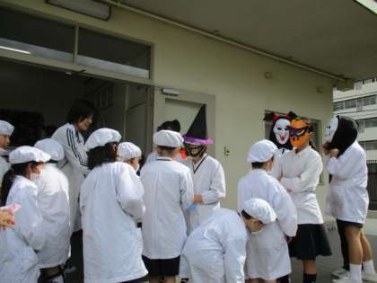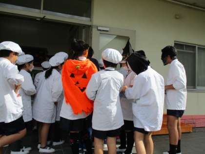 10月末、ハローウィンにちなんで、保健委員会の子ども達は給食調理員さんと相談をして写真のようなお面をかぶり消毒液を配りました。給食をモリモリ食べてほしいとの願いから、このような活動をしているとのことです。