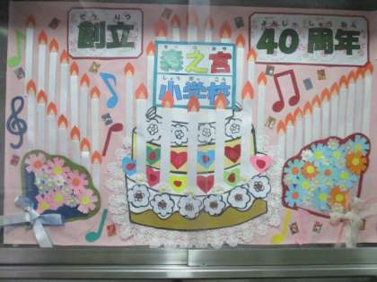 創立40周年に向けて 公開日 2018/11/06 更新日 2018/11/06 学校日記 玄関掲示が変わり、そこには40本のろうそくが立てられたています。月曜日の全校朝会で校長先生が、図書館ボランティアさんの早原さんが作ってくださったポスターを紹介しました。講堂の隅には、何やら赤と白のものが置かれています。さあ、式典当日何に変身するでしょう。学校では、創立40周年記念式典に向けて準備を進めています。 いいね(0)