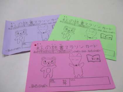 10月25日〜11月16日まで、図書委員会や図書館支援員の大野さんを中心に「校内読書マラソン」を実施しました。5冊読むと「秋の読書マラソンカード」に、はんこが押され、図書委員会のみんなが作ったしおりがもらえるようになっています。図書館記録簿には10月25日〜11月16日までの来館者児童数は453名、貸出冊数は379冊と記録されていました。読書の秋。子どもたちは本の世界を楽しんでいます。