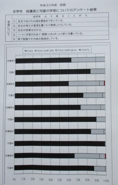学校だよりの裏面に載せていますアンケートは前期の学習についてのアンケート結果で、今回公開しています。森之宮小学校では、教育活動を充実させるために、子どもたちの学びの振り返りと保護者の皆様にもご協力いただき学校評価アンケートを行っています。「家で勉強(宿題を含む)をしている」については、「あてはまる」「どちらかというとあてはまる」の回答が保護者・児童とも90%以上となっています。家庭学習の時間は、学年×10+10分と言われています。家庭学習を少なくとも1年生は20分、2年生は30分、3年生は40分、4年生は50分、6年生は1時間10分していくことが大切です。