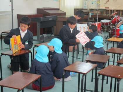 幼小連携の取り組み 公開日 2018/12/19 更新日 2018/12/19 学校日記 前回もお知らせしましたが、大阪市教育振興基本計画では、保幼小中の連携を求めています。その取組として、18日(火)の20分休みに北中道幼稚園児に5年生が絵本の読み聞かせをしました。幼稚園児は少し緊張しながらもしっかり聞いていました。 いいね(0)