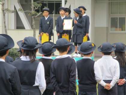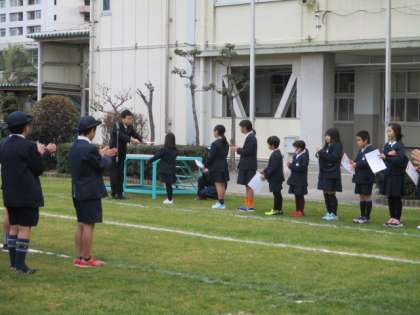 1月15日(火)全校朝会の様子です。校長先生の講話を聞き、次に月初めの朝会では各委員会代表から活動のめあての発表をしました。そして、2学期の「本の貯金王」の表彰です。各学年1名、ページ数の多い児童を表彰しました。6年生の子どもは22950ページも読んでいました。今年度になり努力賞も作り、各学年から1名表彰しています。最後は、生活習慣作りについての点検です。風邪が流行ってきていますので子どもたちには「手洗い・うがい」をするように、そして、ハンカチを持ってくるように指導しました。