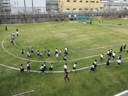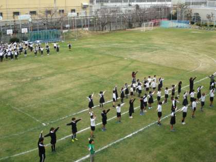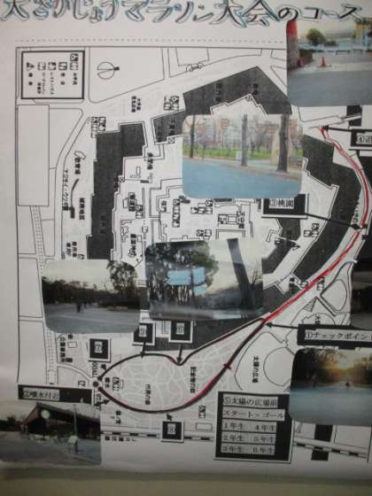 20分休みになると音楽がかかります。耐寒マラソンの始まりです。最初に準備運動をし、次にみんなで一緒に3分間走ります。そして、5分間自分のペースで走り、整理体操をして終わりです。終わった後も自分の目標をめざして練習をしている子どももいます。3枚目の写真はマラソンコースです。スターバックスのお店付近に観光客の出入りがありますので、応援を兼ねて児童の安全確保のお願いしたい場所です。