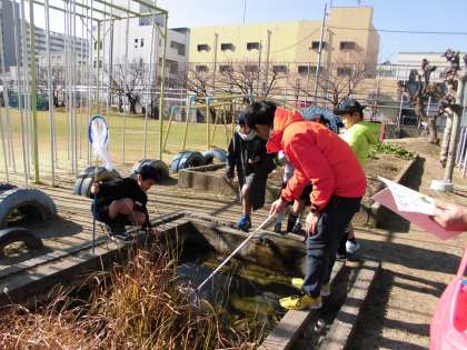 4年生き物さがし出前授業 公開日 2019/01/18 更新日 2019/01/18 学校日記 大阪市環境局の皆さんを講師に迎え、森之宮小学校の生き物探しをしました。初めに講師の方が用意してくださっている映像をもとに、生物多様性の意義や春夏秋冬の季節の変化に対応しながら生きている様子を知りました。次に、校内にある池に行き、生き物を採取し、冬の生き物の様子を調べました。子どものつぶやきにも、適格な返答をしていただき知識の豊富な講師の方ばかりで子どもにとって密の濃い学習となりました。 いいね(0)