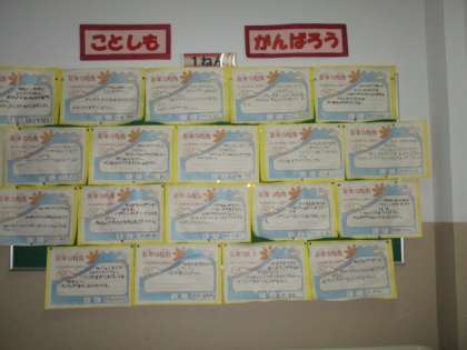 森小の校内には、いたるところに子どもの「文字」が見られます。その文章や言葉から、子どもの個性や気持ちが伝わってきます。先生方は子どもの表現を大切にし、掲示物を通して自尊感情を高め、互いのよさを認め合う子どもの育成に努めています。