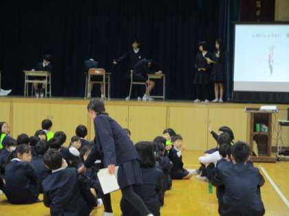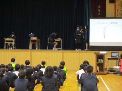 よい姿勢をしよう 公開日 2019/02/12 更新日 2019/02/12 学校日記 学校評価アンケートの生活についての項目に「日ごろからよい姿勢に気をつけている。」があります。アンケート結果では、肯定的評価が保護者は66%、児童は90%となっています。2月7日(木)の健康委員会による集会では、よい姿勢はどのような姿勢かや、姿勢が悪いと体にどんな影響がでるかを映像や演技でみんなに知らせました。最後に姿勢体操をしました。 いいね(0)