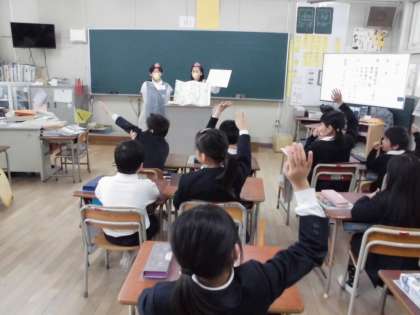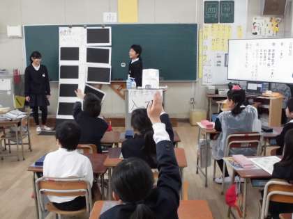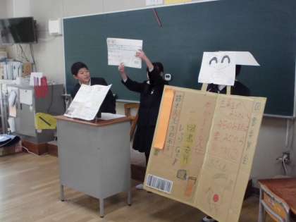 国語科で学習したことを活かしました。 公開日 2019/02/14 更新日 2019/02/14 学校日記 5年の国語科の学習で、「伝えよう、委員会活動」という単元があります。ねらいは、必要な情報を整理して活動報告を書くことと、分かりやすいリーフレットの構成を考える。です。5年の子どもたちは所属している委員会の活動を3年生に劇化したりクイズ式にしたりしながら、分かりやすく伝えていました。3年生の児童は、4年生になったら〇〇のことをしたいな。という意欲をもったことと思います。 いいね(0)