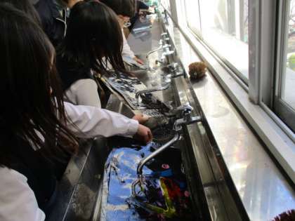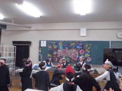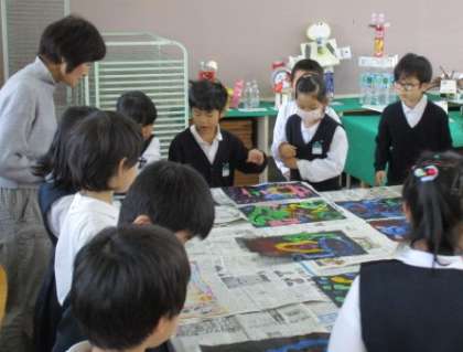2年図工科公開授業 公開日 2019/03/06 更新日 2019/03/06 学校日記 2年生は図工科で「まよなかのパーティーへいこう!」という題材で公開授業をしました。真夜中に開く王子様のお祝いのパーティーへ招待され、なりたおばけに変身して行こうという設定です。最初にのり絵具を使って変身したいおばけを描きます。次に真夜中なので版画インクで真っ暗にします。最後に水で流しておばけをよみがえらせ、パーティーを開きました。子どもたちは、どきどき、ひやひや、最後はヤッターの喜びで終わりました。 いいね(0)