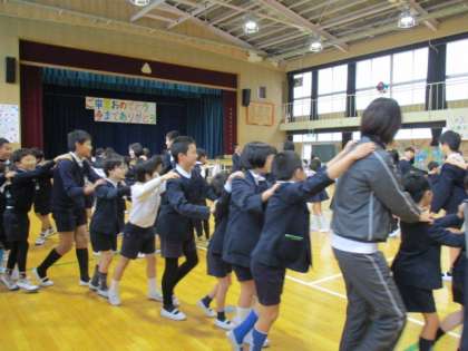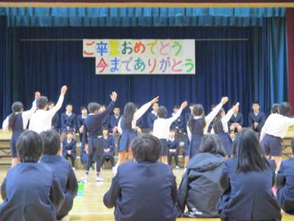 卒業お祝い集会 公開日 2019/03/07 更新日 2019/03/07 学校日記 3月6日(水)の1校時全校児童で6年生の卒業をお祝いする集会を実施しました。集会のめあては、「6年生に40最高 至上最高の 感謝をとどけよう!」です。めあてに向けて5年生を中心に縦割り班で感謝のメッセージカードを作ったり全校児童で呼びかけを入れたダパンプのUSAの踊りを練習したりしました。全校児童の心が1つになった集会でした。 いいね(0)
