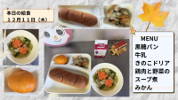 今日の給食は、コッペパン、いちごジャム、牛乳、牛肉のデミグラスソース煮、ウインナーのスープ、きゅうりのピクルスでした。