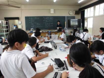 6年生は理科の実験、考察をしていました。金属を溶かす水溶液を調べた後、次に確認してみたいことを話し合っていました。「酸性、アルカリ性が発生しているのではないか」「解けた後の鉄の変化を調べたい」など、班で調べてみるとおもしろそうな意見をたくさん出していました。