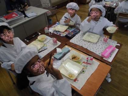 1年生の給食の様子です。今日は団子がありました。給食主任の先生から「慌てず、よく噛んで食べるよう」に放送があり、話を聞きに行くと、「しっかり噛んで食べたよ!」と完食していました。