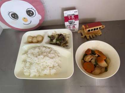 今日の給食は、ごはん、牛乳、一口がんもとさといものみそ煮、牛肉と野菜のいためもの、みたらしだんごでした。